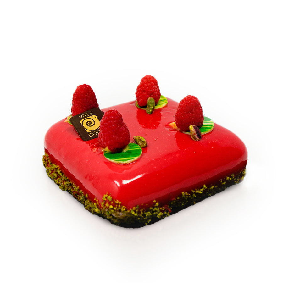 Come la gemma preziosa da cui prende il nome, Rubino è la nostra torta delizia rara per il palato. Composta da uno strato di Bavarese al lampone e arricchita da Bisquit al pistacchio, con Gelee di lamponi e Namelaka al pistacchio, per concludere con Glassa neutra dal caratteristico colore rosso acceso.