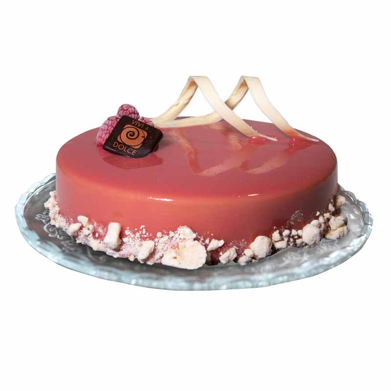 Una delicatissima mousse al cioccolato RUBY (il 4° tipo di cioccolato naturalmente rosa) arricchito da una purea di lamponi e ricoperto da una glassa al cioccolato RUBY.